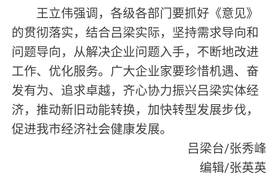 導(dǎo)語:10月13日,市委書記李正印主持召開我市深入學(xué)習(xí)貫徹落實中共中央、國務(wù)院《關(guān)于營造企業(yè)家健康成長環(huán)境弘揚優(yōu)秀企業(yè)家精神更好發(fā)揮企業(yè)家作用的意見》(下稱《意見》)座談會,共商呂梁經(jīng)濟發(fā)展大計。市長王立偉、市人大常委會副主任梁來茂、副市長楊巨才出席會議。9大產(chǎn)業(yè)13個行業(yè)協(xié)會負(fù)責(zé)人參加會議。